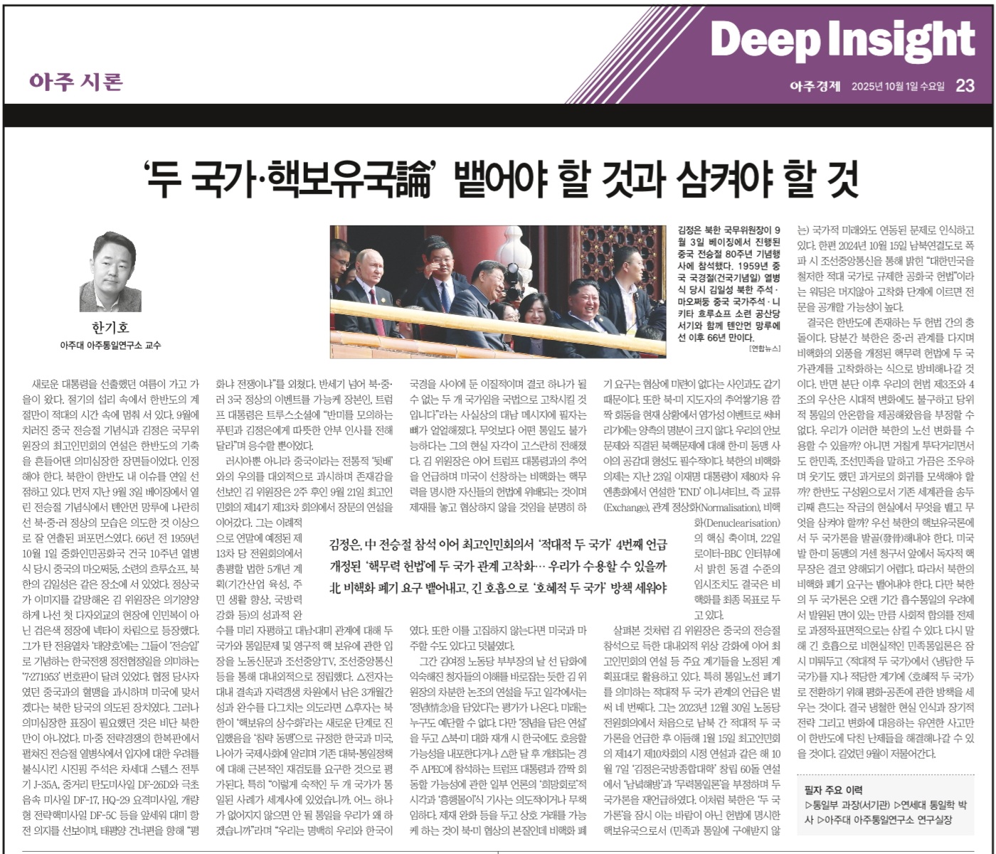 20250928 [교수칼럼][한기호 칼럼] 두 국가·핵보유국論, 뱉어야 할 것과 삼켜야 할 것