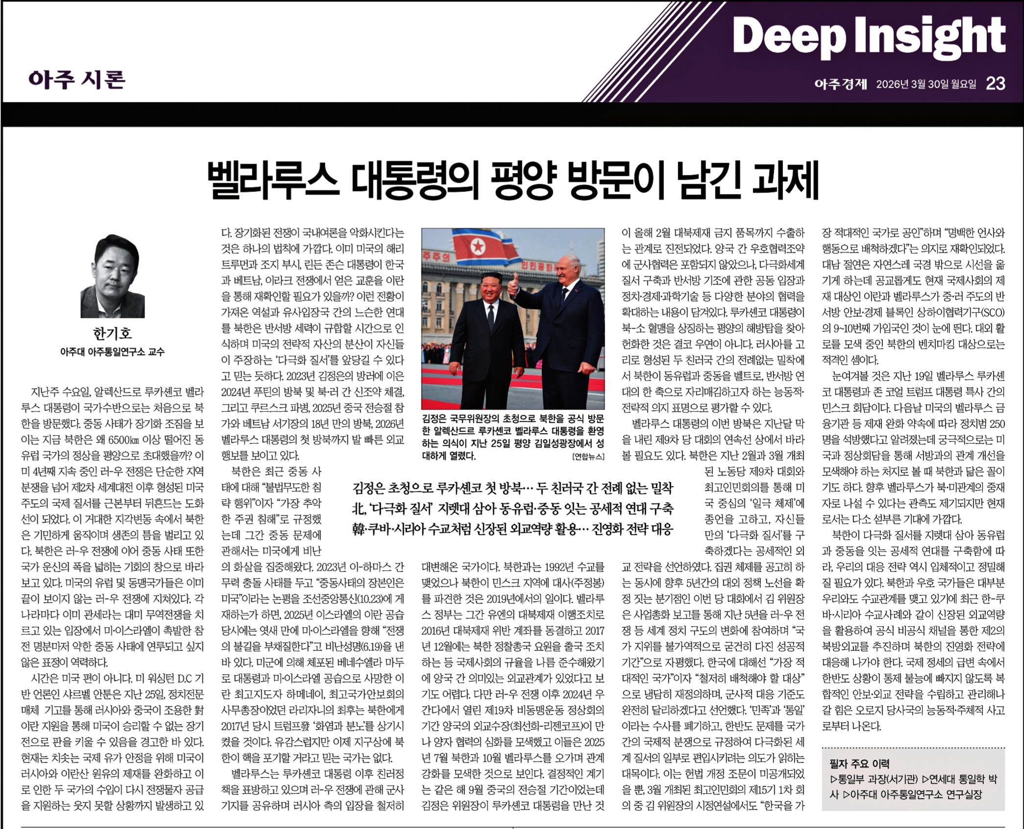 20260330 [교수칼럼] [한기호 칼럼] 벨라루스 대통령의 평양 방문이 남긴 과제