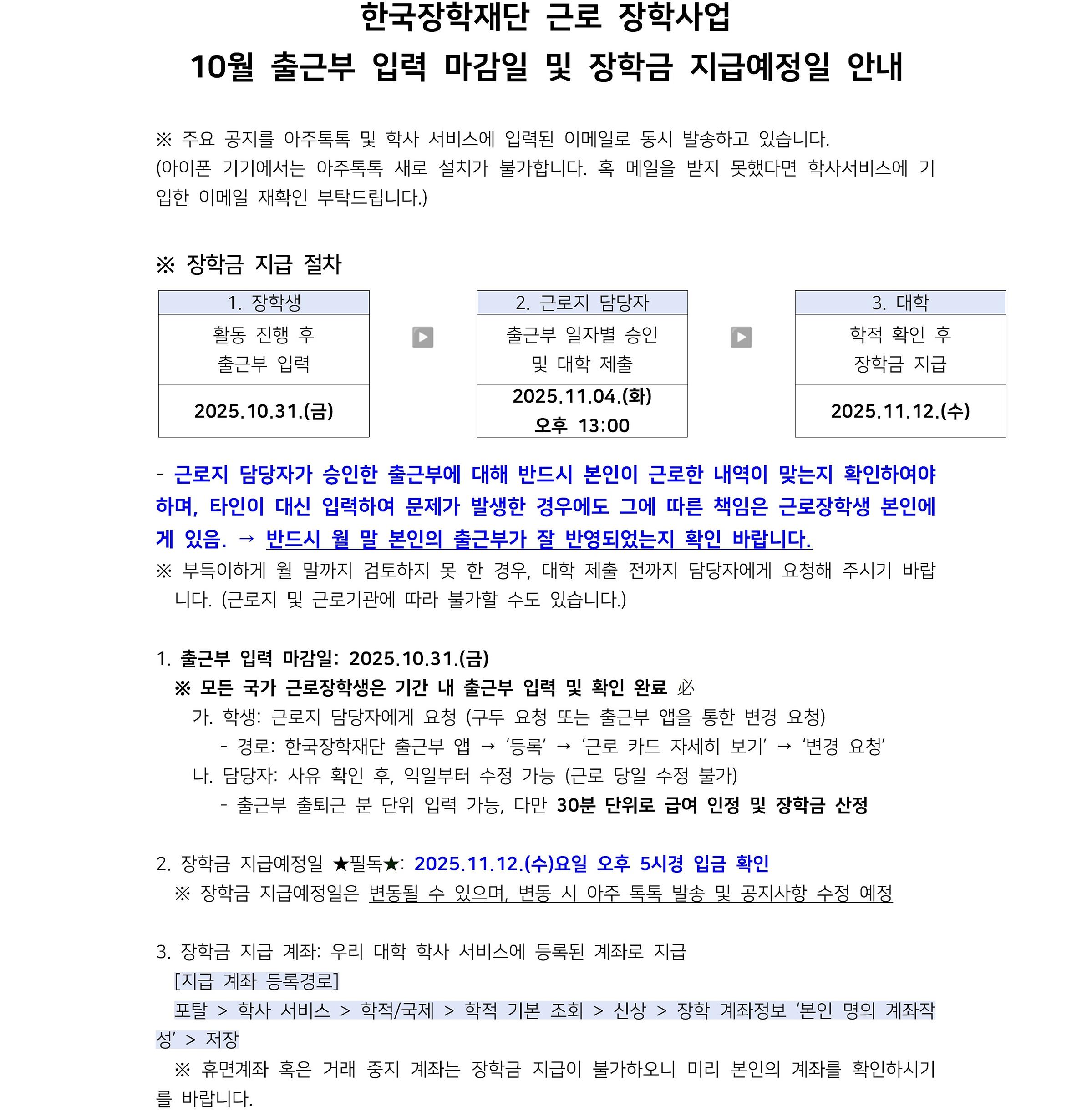 [장학] [학생지원팀] 근로성 장학 10월 출근부 입력 마감일 및 장학금 지급 예정일 안내
