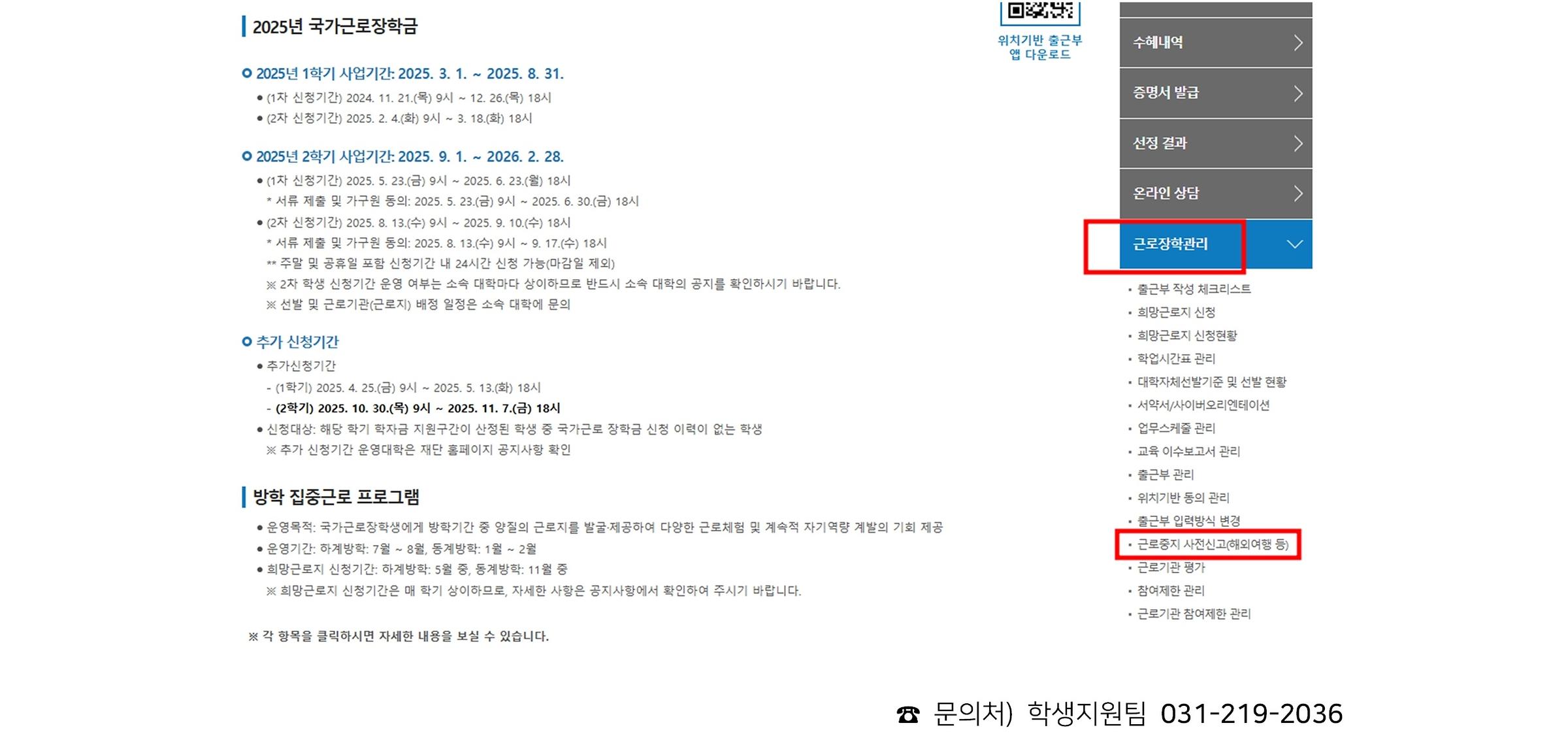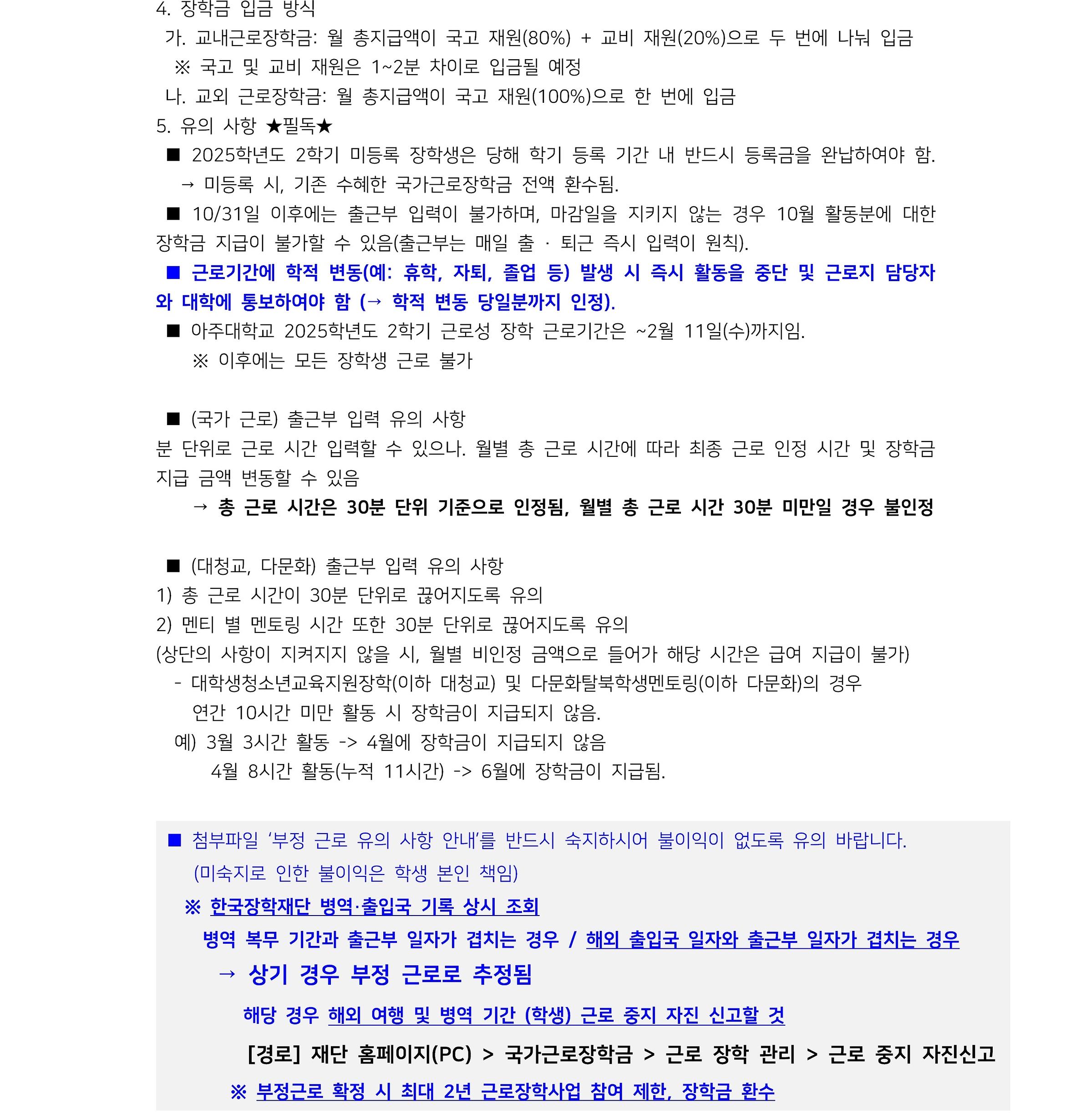 ※ 근로중지자진신고는 일정 이전에 진행해야 하며, 사전에 입력하지 못한 경우 학생지원팀으로 연락 바랍니다.