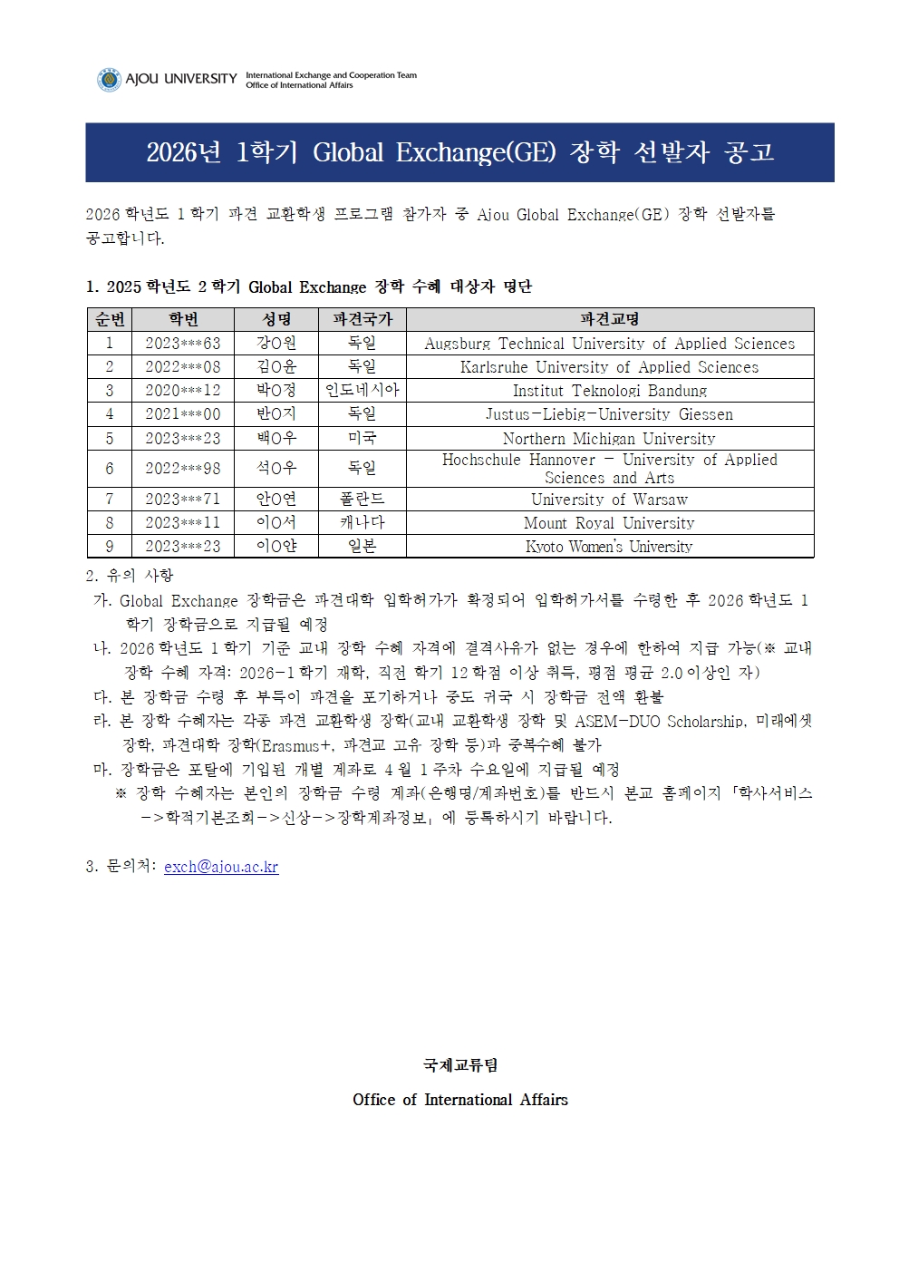 [공지] 2026-1학기 파견 교환학생 장학 선발자 발표(TE, GE, GC)
