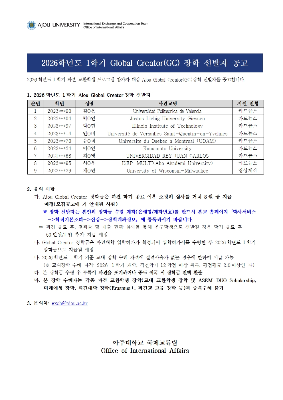 2026-1학기 파견 교환학생 장학(TE, GE, GC)최종합격자를 아래와 같이 공고합니다.
